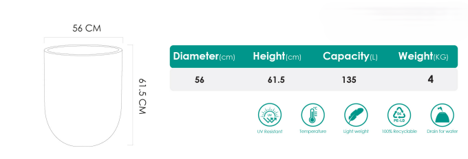 אדנית דגם אוליביה 135 ליטר עשויה פלסטיק איכותי. עמידה בפני קרינת UV, קלת משקל, 100% ניתן למחזור, מסננים למים. מידות: קוטר- 56 ס''מ, גובה- 61.5 ס''מ. משקל- 4 ק''ג.