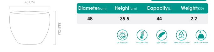 אדנית דגם שרי 44 ליטר עשויה פלסטיק איכותי. עמידה בפני קרינת UV, קלת משקל, 100% ניתן למחזור, מסננים למים. מידות: קוטר- 48 ס''מ, גובה- 35.5 ס''מ. משקל-2.2 ק''ג
