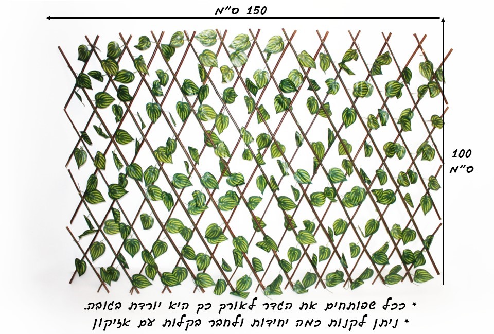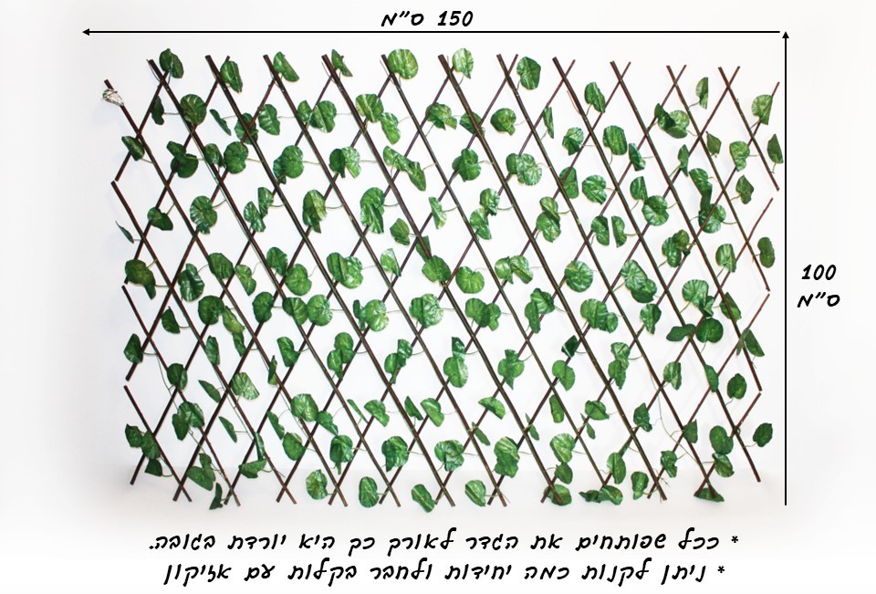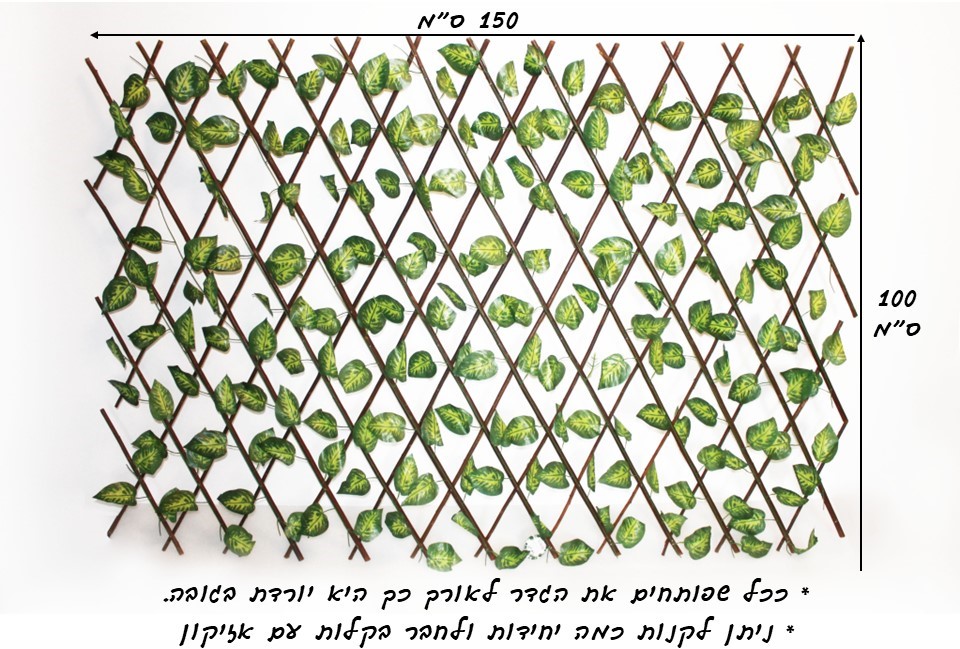 גדר עלים מתכווננת לאורך ולגובה באמצעות פתיחה וסגירה גדר עלים דקורטיבית . השלד עשוי במבוק איכותי המחובר ויוצר אקורדיון מידות במצב סגור : גובה 120 ס"מ | אורך 30 ס"מ מידות במצב פתוח: גובה 100 ס"מ | אורך 180 ס"מ מידות במצב פתוח: גובה 65 ס"מ | אורך 300 ס"מ ככל שפותחים את הגדר לאורך כך היא יורדת בגובה. ניתן לקנות כמה יחידות ולחבר בקלות עם אזיקון ניתן לשימוש במרפסות / חללים סגורים / דקורציה לגדרות לעיצוב דקורטיבי ויפה / הפרדה בין מרפסות ועוד .