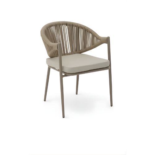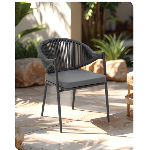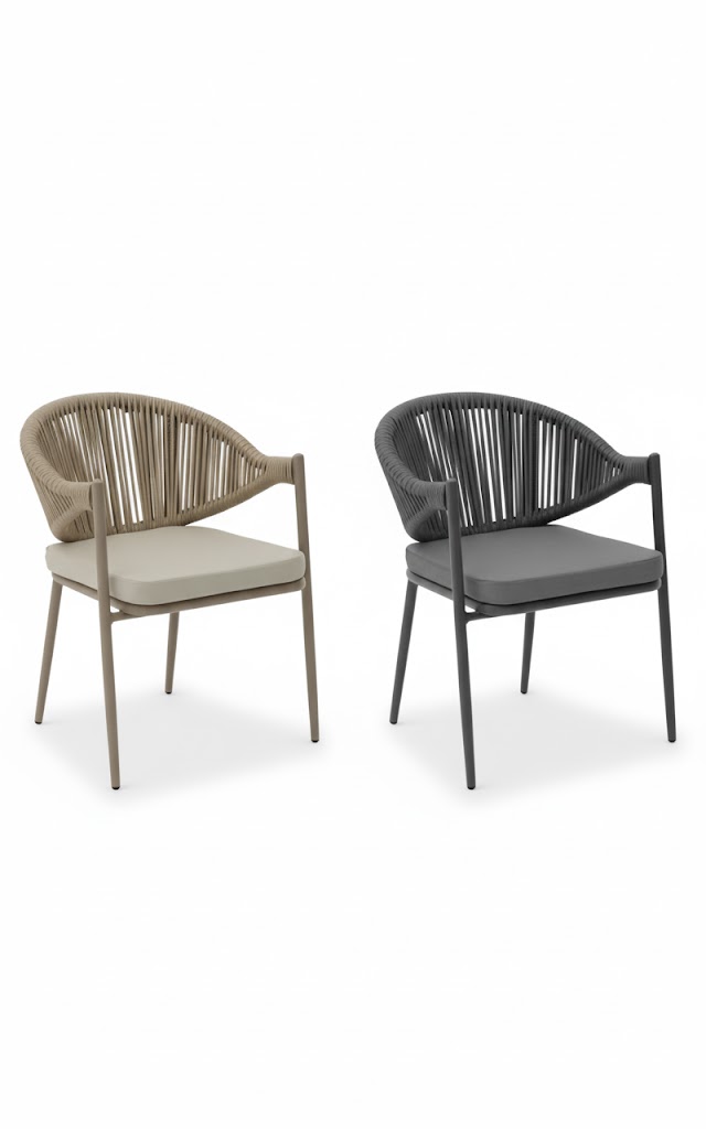 גב הכיסא מעוצב בקליעת חבלים איכותית בסגנון מעוגל ורך, המעניק תמיכה נעימה ומראה מודרני ומיוחד.