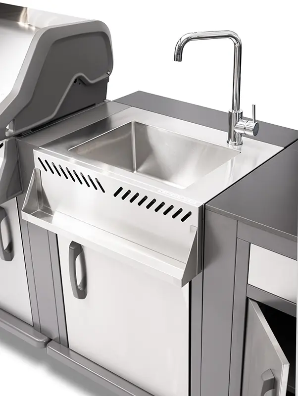 מידות : אורך: 77.4 ס"מ (כולל בסיס היחידה) | עומק: 69.2 ס"מ (כולל בסיס היחידה והפאנל סגירה העליון) | גובה: 90 ס"מ. יחידת כיור | NRSC425SG-SS יחידת כיור אלגנטית הכוללת ברז איכותי, ניקוז וארון אחסון – פתרון מושלם לשטיפת ירקות, כלים והכנת מזון כחלק ממטבח החוץ המלא שלך. תכונות עיקריות: