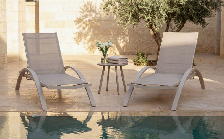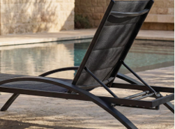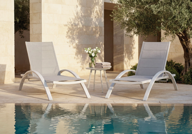 מיטת שיזוף עשויה אלומיניום קל משקל, בעיצוב מודרני ונקי המעניק נוחות מקסימלית ועמידות לאורך זמן.