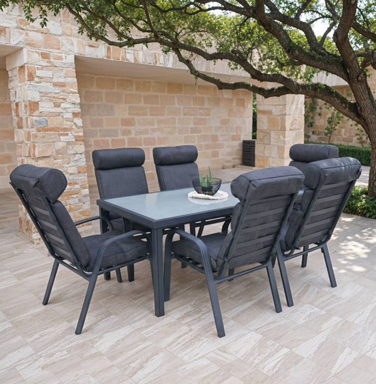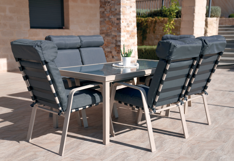 מערכת ריהוט גן המעוצבת במיוחד למפגשים חברתיים ואירוח. השילוב בין מבנה אלומיניום עוצמתי לגימור מדויק מעניק פתרון פונקציונלי ומראה יוקרתי לחצר, למרפסת או לגינה.