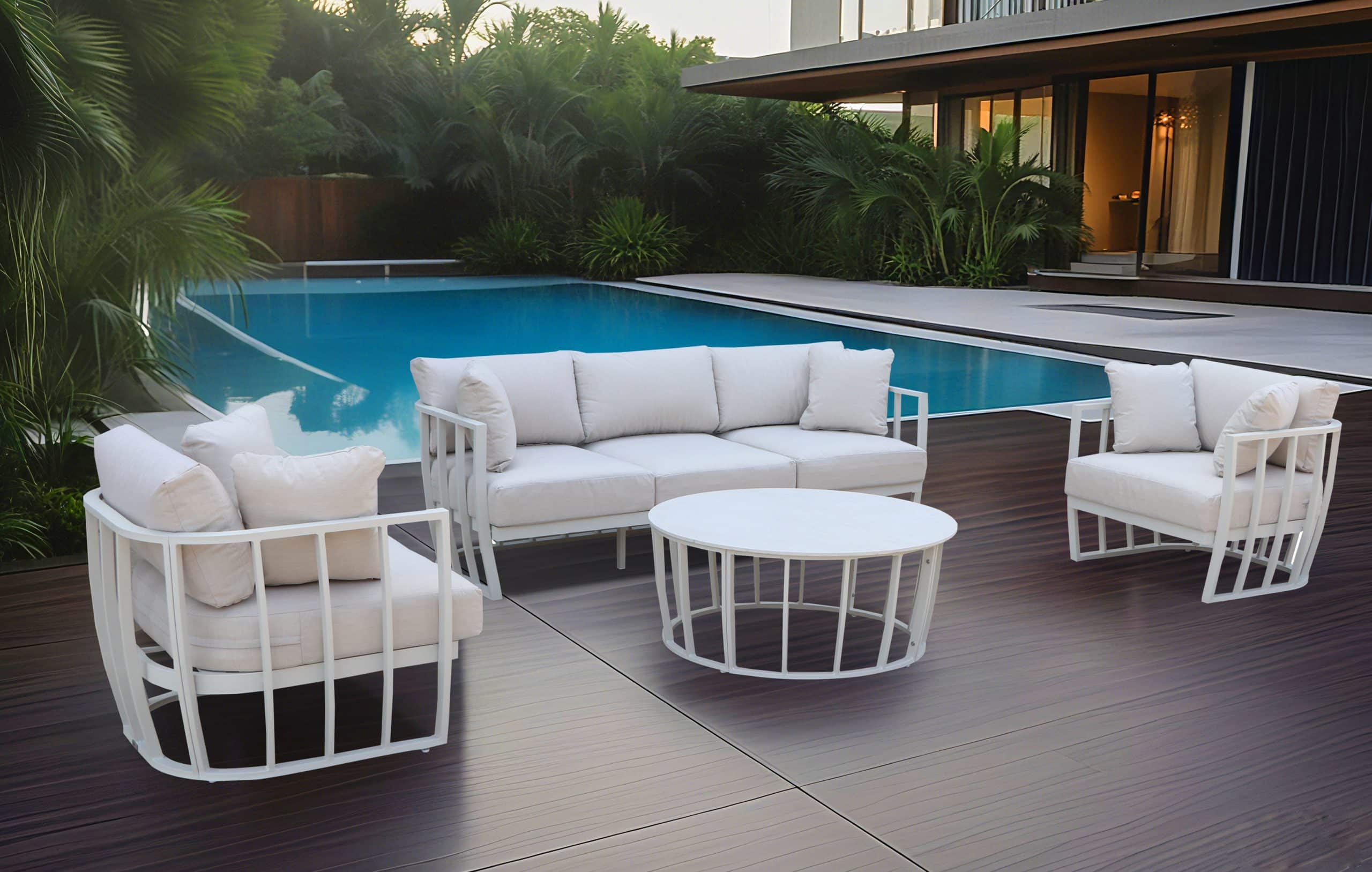 מערכת ישיבה פרימיום בעיצוב מודרני ויוקרתי, המיועדת להעניק חוויית אירוח מפנקת בחצר, בגינה או במרפסת מקורה.