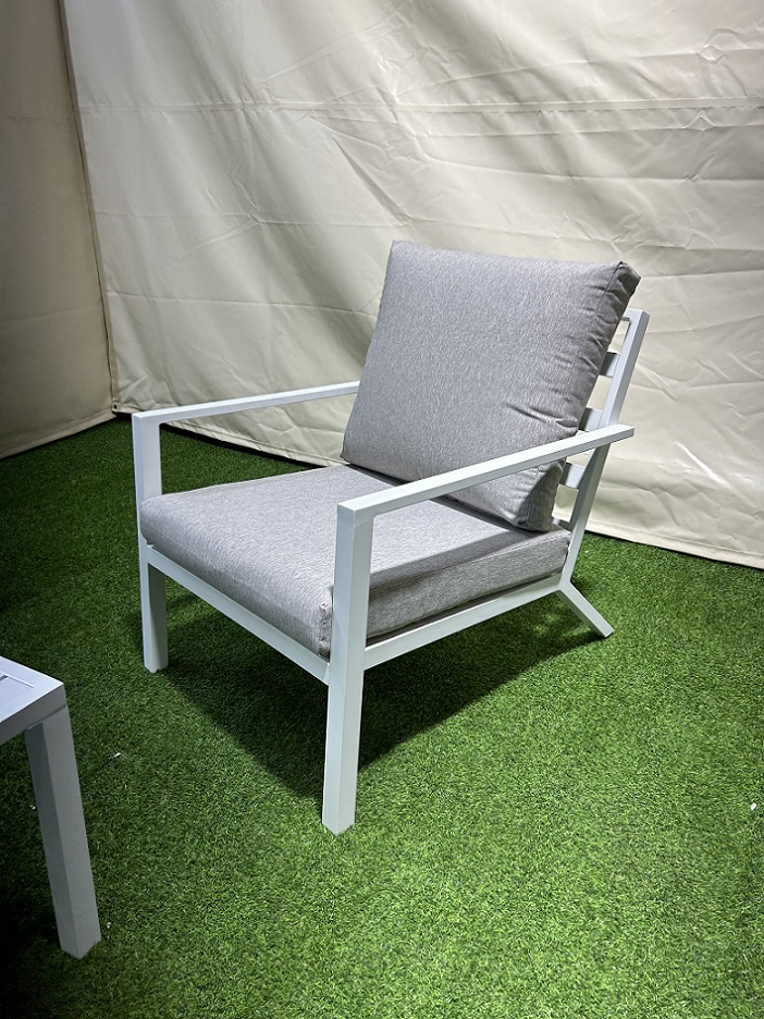 מערכת ישיבה לגינה המעניקה ישיבה נוחות עשויה ממבנה 100% אלומיניום כולל כריות גב ומושב, עשוי מבד פוליאסטר. הסט מורכב מ-4 חלקים - ספה תלת + 2 כורסאות יחיד + שולחן נמוך קיים בצבע לבן או אפור כהה. מידת: ספה תלת מושבית 204X92 ס"מ גובה 80 ס"מ. כורסאת יחיד 70X92 ס"מ גובה 80 ס"מ. שולחן קפה 100% אלומיניום 130X57.5 ס"מ גובה 45 ס"מ.