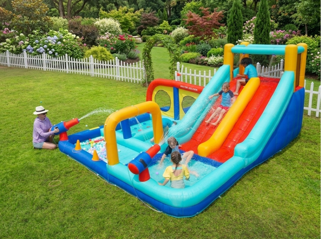 מתקן מתנפח גדול ומרשים במיוחד הכולל מגלשה, אזור קפיצה ומשחקי מים, חוויית קיץ מושלמת לילדים!