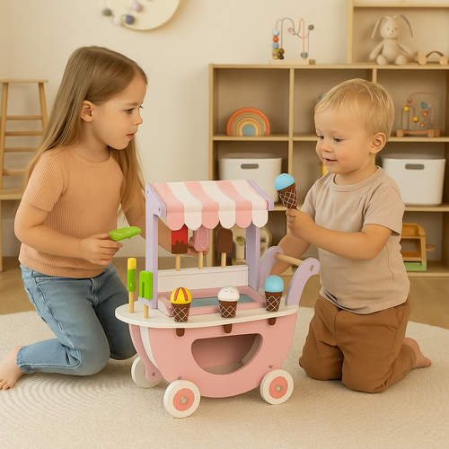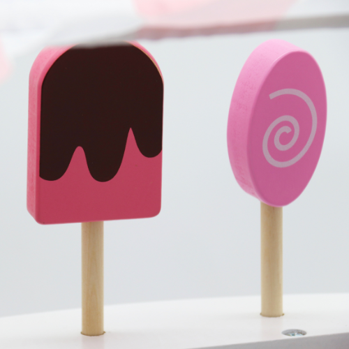 העגלת גלידה בעיצוב מתוק בצבעי פסטל, כוללת גלידות ומקלות ארטיק מעץ.