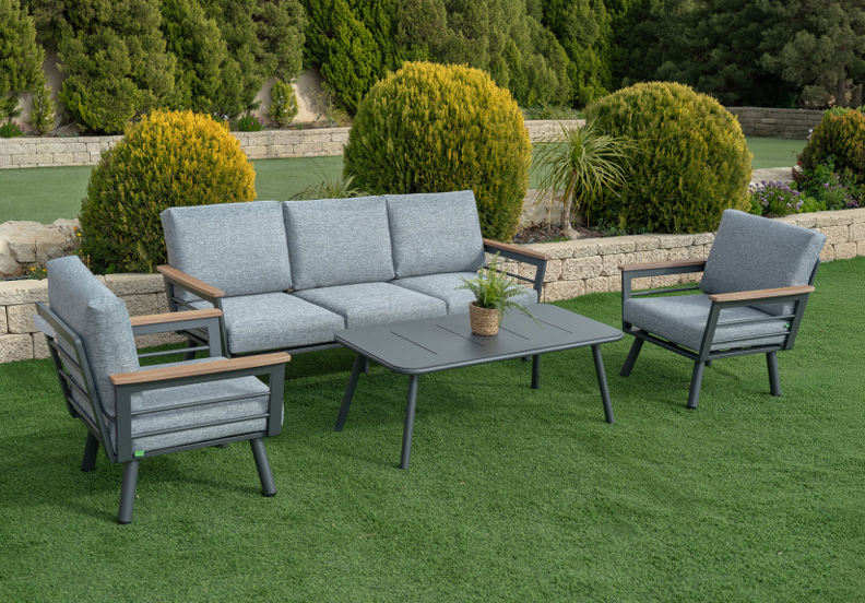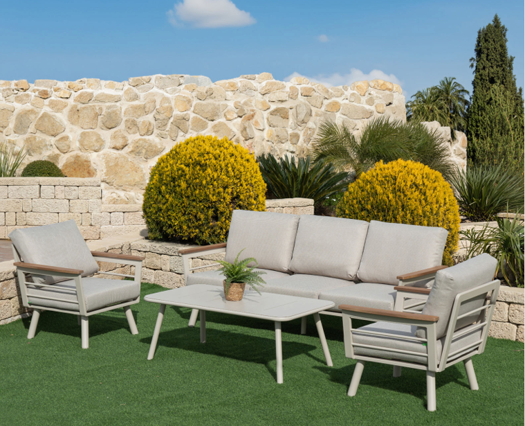 מערכת ישיבה מאלומיניום איכותי עם שילוב של פולי-ווד (Polywood) על משענות הידיים, המעניק מראה חמים ואלגנטי לצד חוזק ועמידות גבוהה. פתרון מושלם לחללי חוץ עם עיצוב מוקפד ונוחות מרבית.