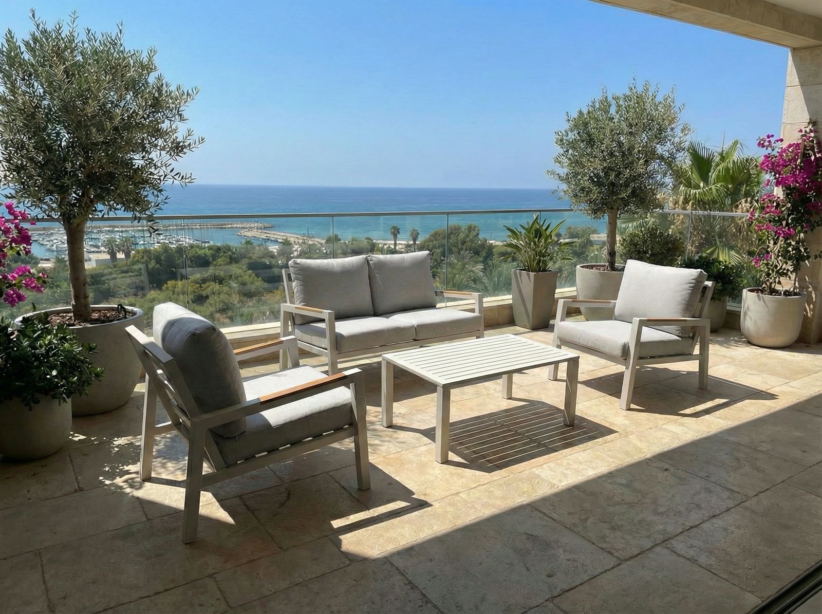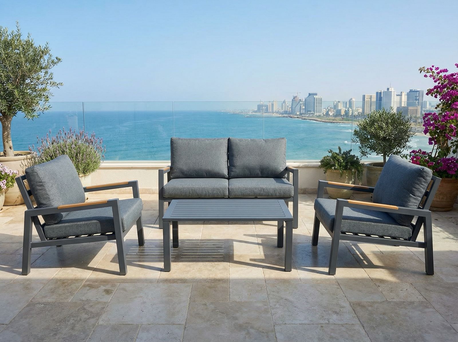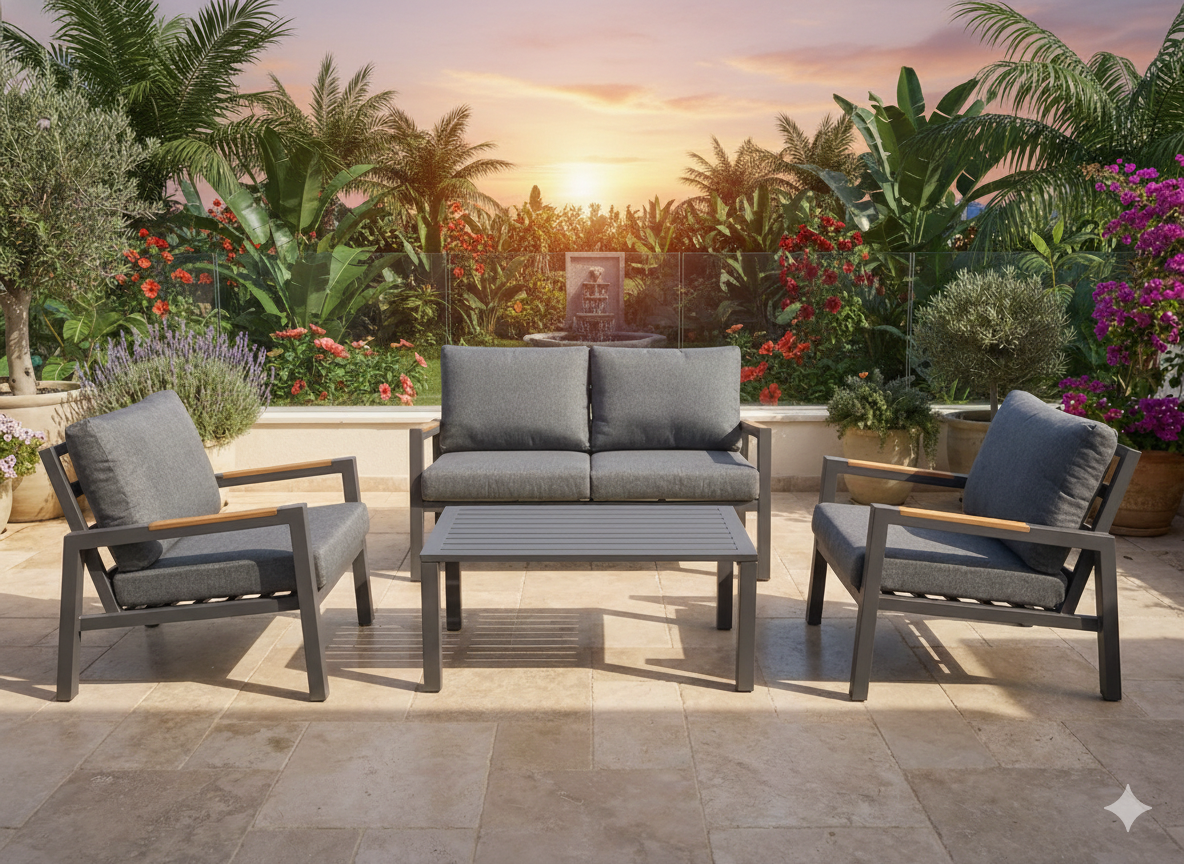תיאור כללי: מערכת ישיבה יוקרתית לחצר ולמרפסת, המשלבת שלדת אלומיניום מאסיבית ועמידה עם נוחות ישיבה גבוהה. הסט מעוצב בקווים מודרניים ונקיים, עמיד בפני פגעי מזג האוויר וקל לתחזוקה.
