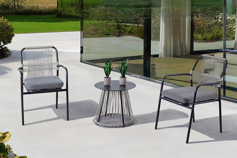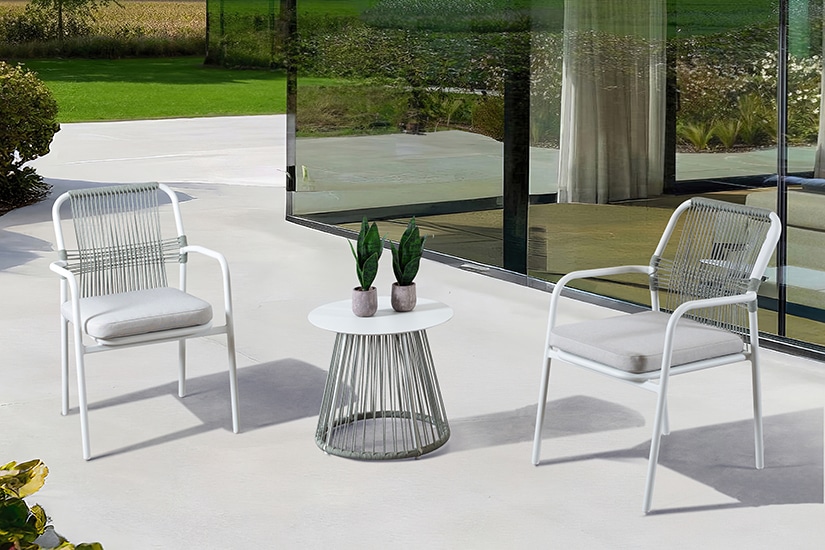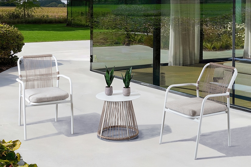 פינת קפה דגם "סול", זוג כורסאות ושולחן מעוצבים מאלומיניום משולב חבלים.