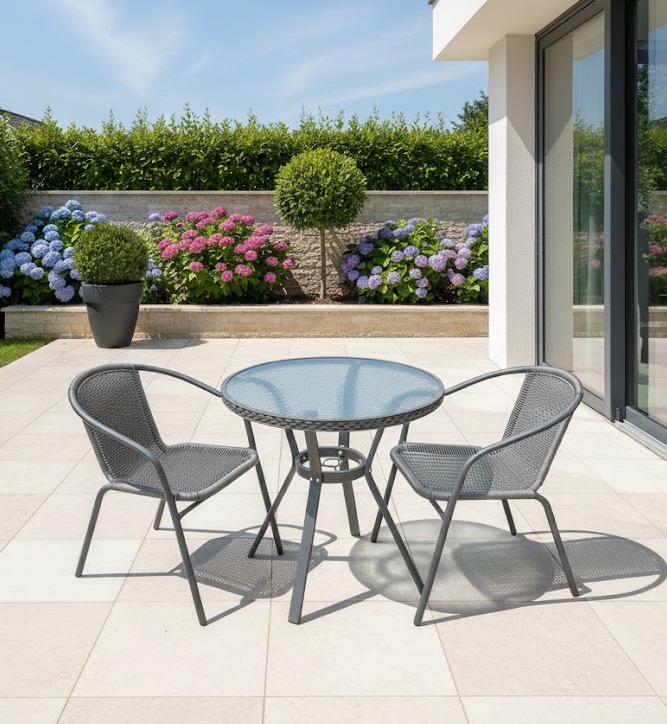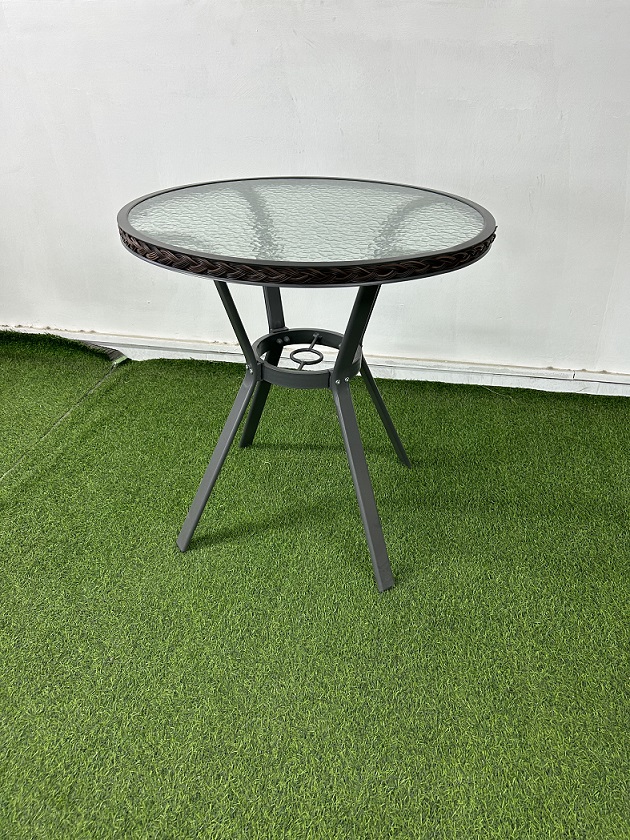 שולחן עגול עשוי מאלומיניום וזכוכית מחוסמת. מסביב עיצוב מרצועות מראטן סינטטי. צבע אפור כהה. קוטר 72 ס"מ, גובה 74 ס"מ. כסאות עשויים מראטן סנטטי ומסגרת מברזל.