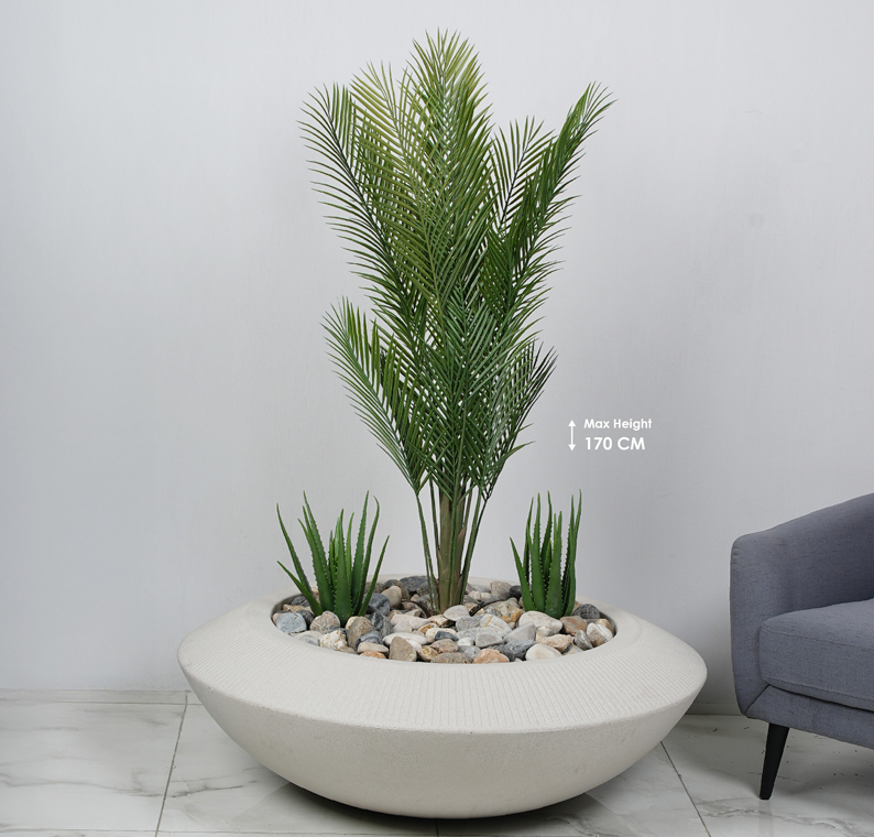 הפתרון האולטימטיבי ליצירת מוקד עניין מרשים (Focal Point) בחללים גדולים, לובי של בניינים, אולמות תצוגה או חצרות מעוצבות. סט הפלורינה פרימיום מציע שילוב מונומנטלי בין אדנית עגולה ורחבה במיוחד לבין עץ דקל קוואי (Kwai) בגובה 150 ס"מ, המעניק מראה יוקרתי, טרופי ומרגיע ללא צורך בתחזוקה.