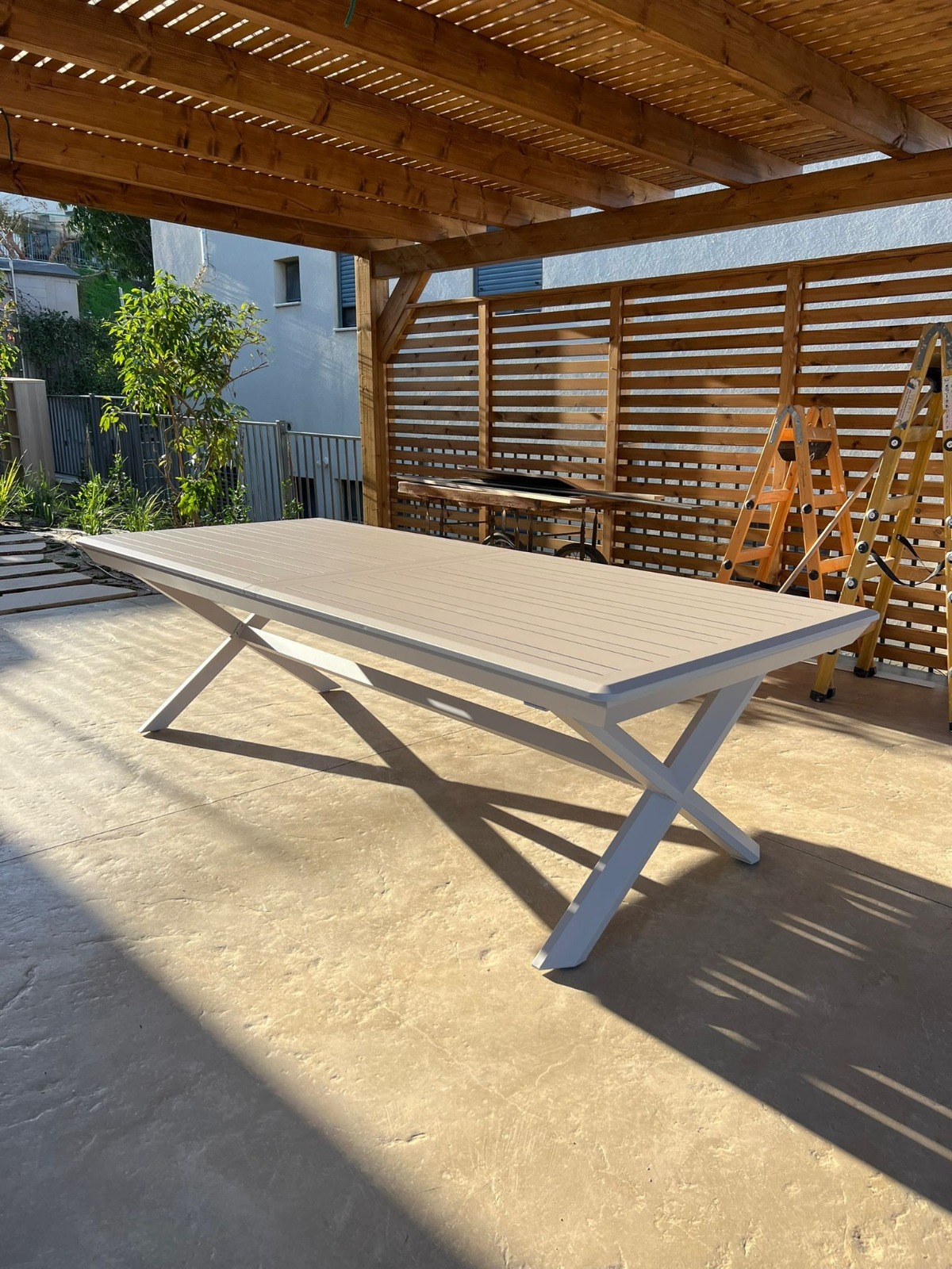 שולחן אלומיניום יוקרתי ומרשים בעיצוב מודרני עם רגלי X עבות ומעוצבות.