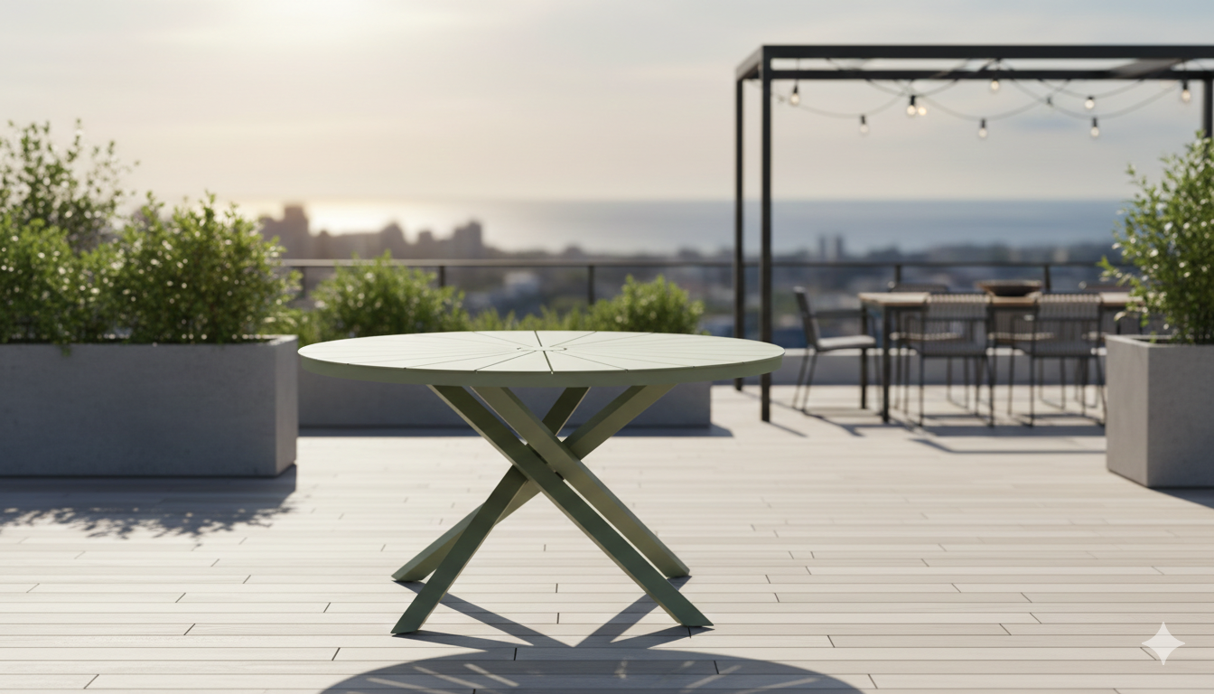 הפלטה היא האלמנט המרכזי שמושך את העין. היא אינה עשויה מיחידה אחת חלקה, אלא מעוצבת בטכניקת "קרני שמש" חלוקה רדיאלית: הפלטה מורכבת משלבים צרים המתרחבים מהמרכז כלפי חוץ, מה שיוצר תחושה של תנועה ומרחב. דיוק גיאומטרי: במרכז השולחן ישנו אלמנט עגול קטן המאחד את כל ה"קרניים", מה שמעניק מראה סימטרי ויוקרתי. פונקציונליות: המרווחים הקטנים בין השלבים מאפשרים ניקוז מים (במידה והשולחן מיועד לחוץ) ומונעים מראה כבד ומסיבי מדי.