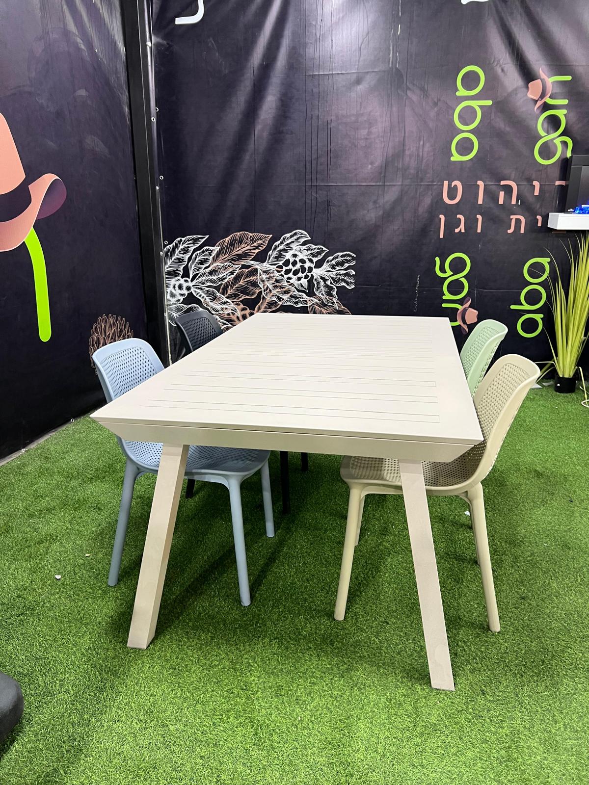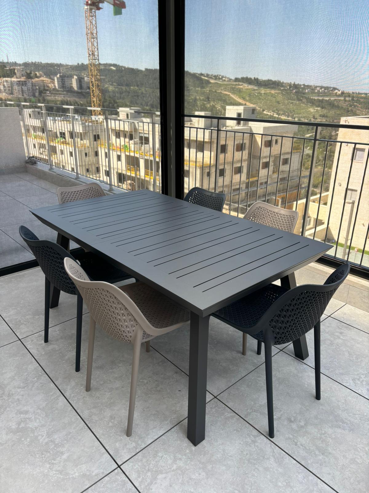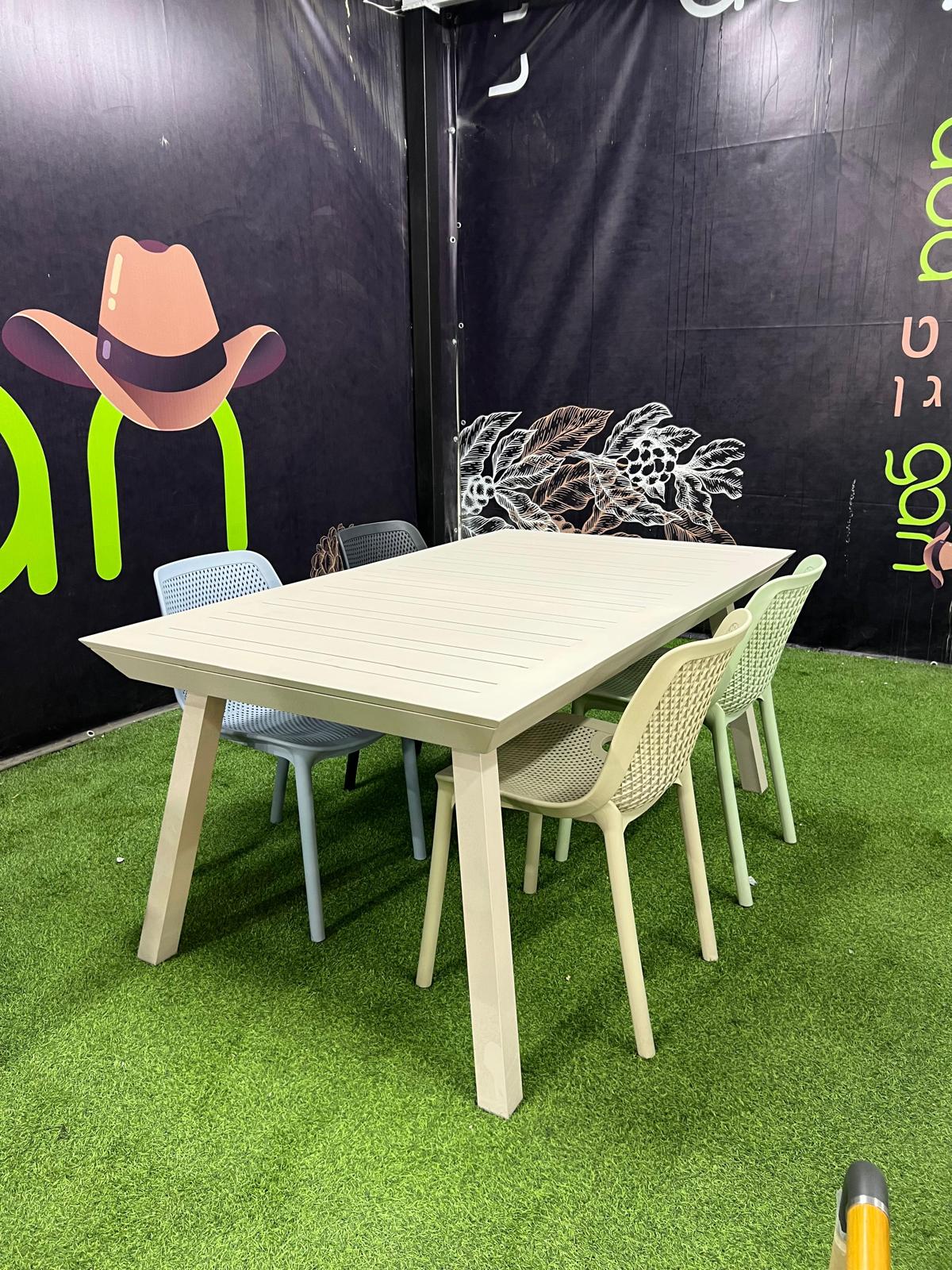 שולחן אלומיניום מלא, נפתח בקלות באמצעות מנגנון פתיחת ספר חזק ועמיד לאורך זמן. עיצוב מודרני עם רגלי אלכסון ליציבות מרבית, מתאים לאירוח משפחתי ולגינה.